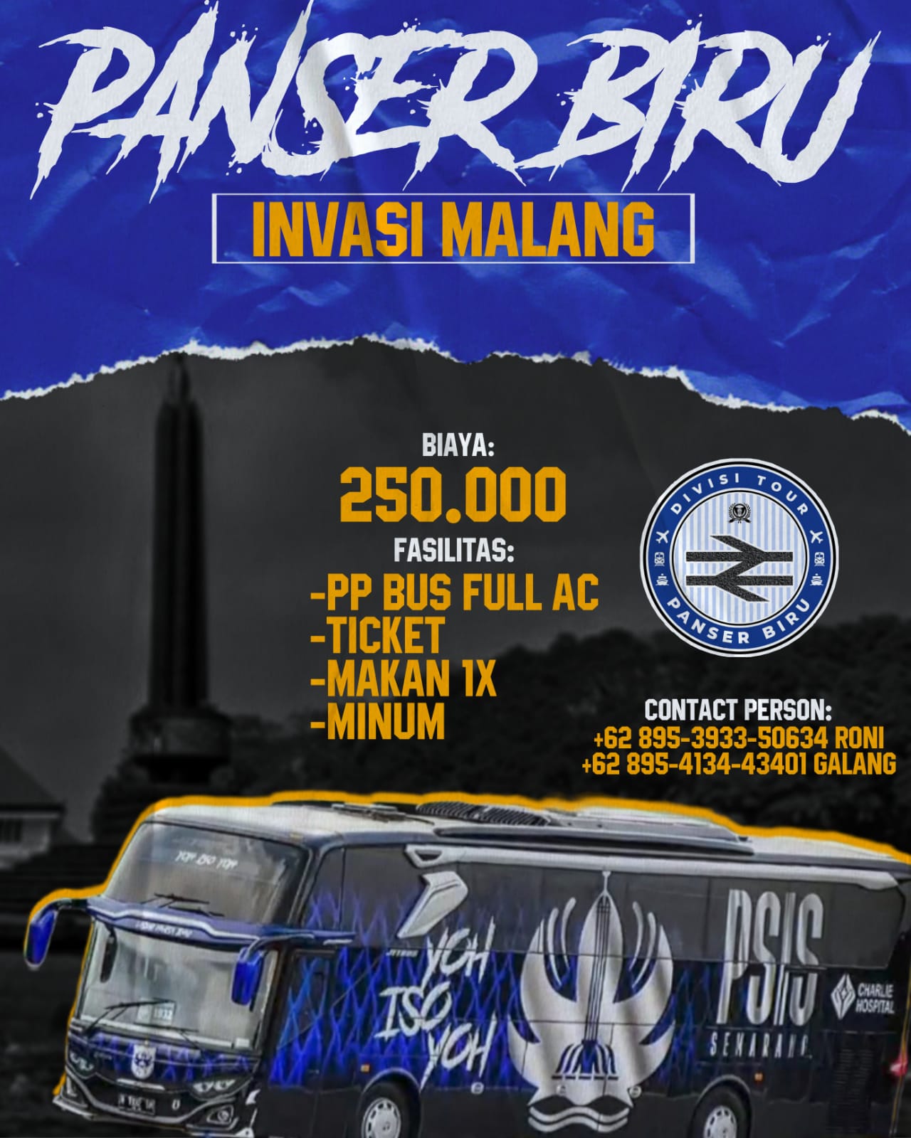 Bagi anggota Panser Biru yang ingin berangkat Tour dikenai biaya Rp 250.000,- setiap orang. Dengan berangkat menggunakan bus , makan 1x dan sudah termasuk tiket pertandingan. Pendaftaran tour bisa langsung ke Panser Biru Store yang berada di Komplek Ruko Stadion Citarum Semarang.