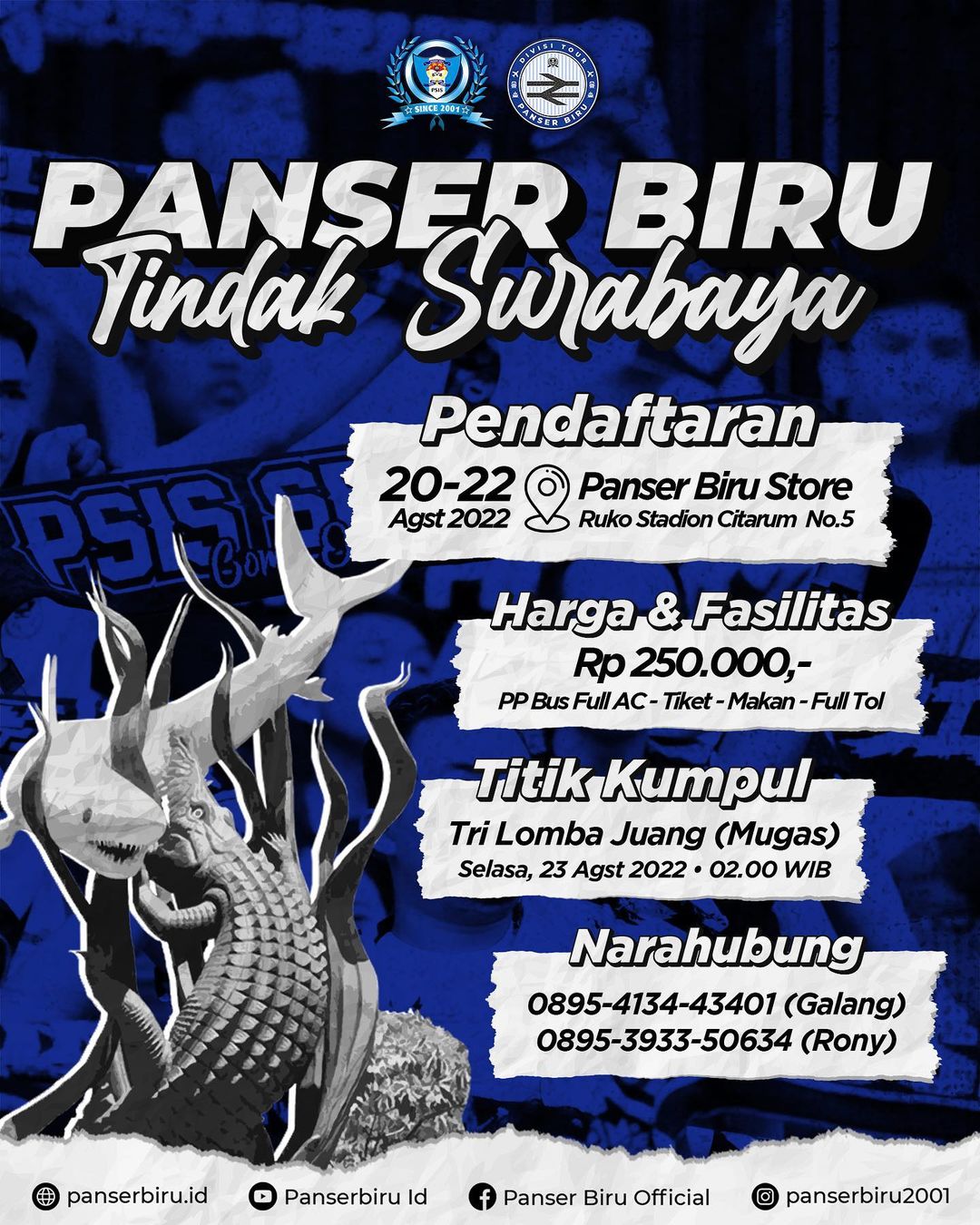 Informasi jadwal pendaftaran melalui divisi tour Panser Biru atau Langsung ke Panser Biru Store hubungi :